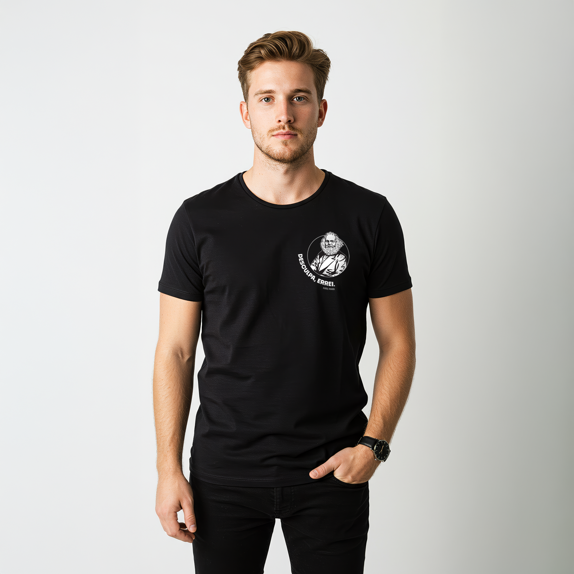 Camiseta Masculina Preta "Desculpa, errei" – Karl Marx